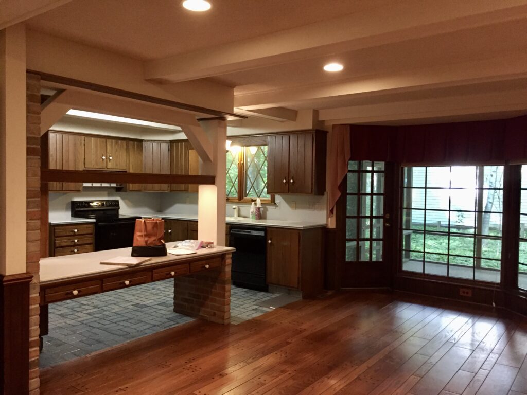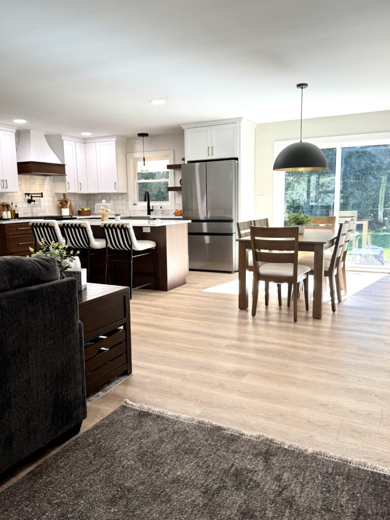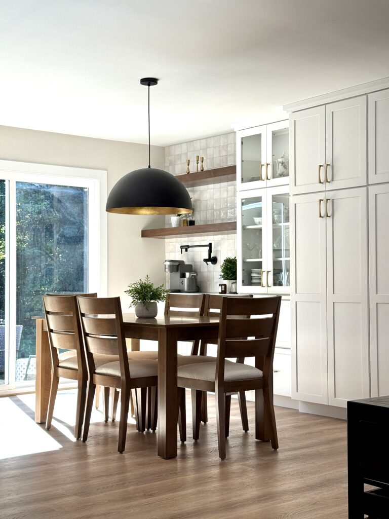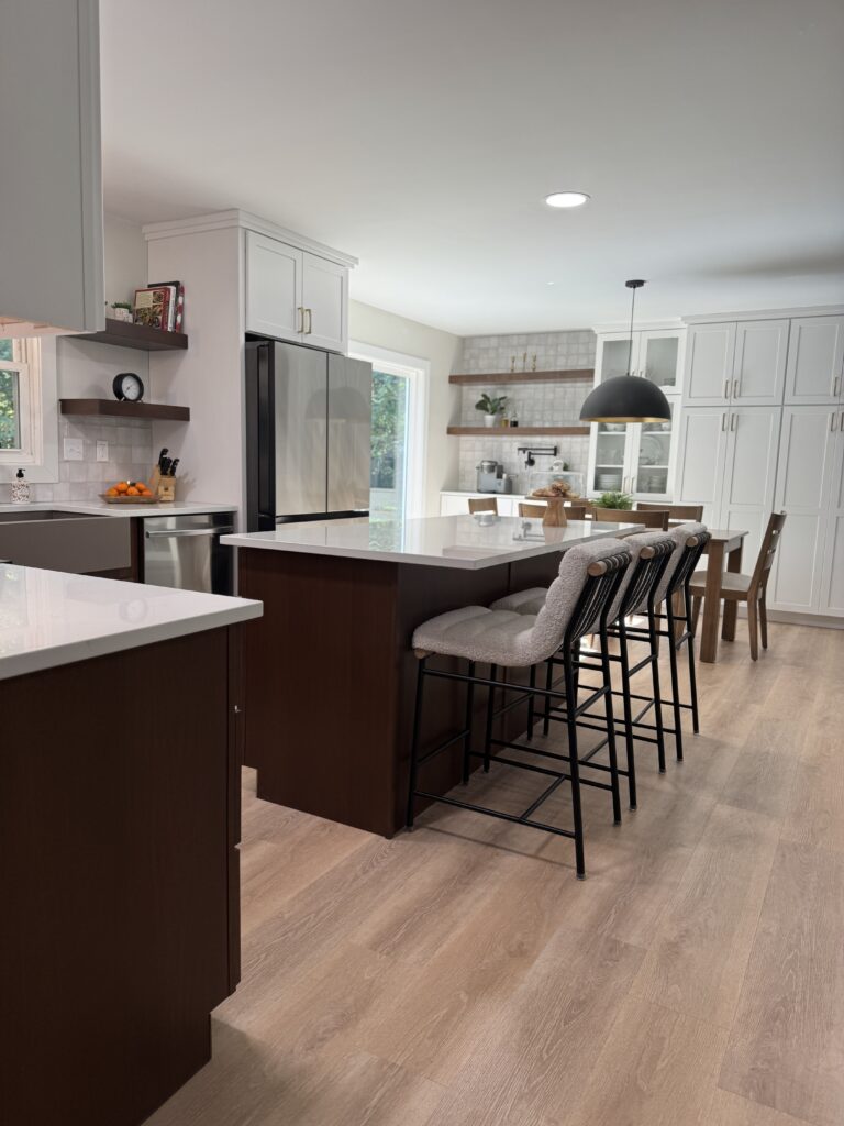 Primary Designer. The homeowners wanted a larger kitchen, so we took down the original dining room wall and expanded the footprint. We carved out space for the new dining room in the oversized living room and added much-needed task lighting and a 10′ island.