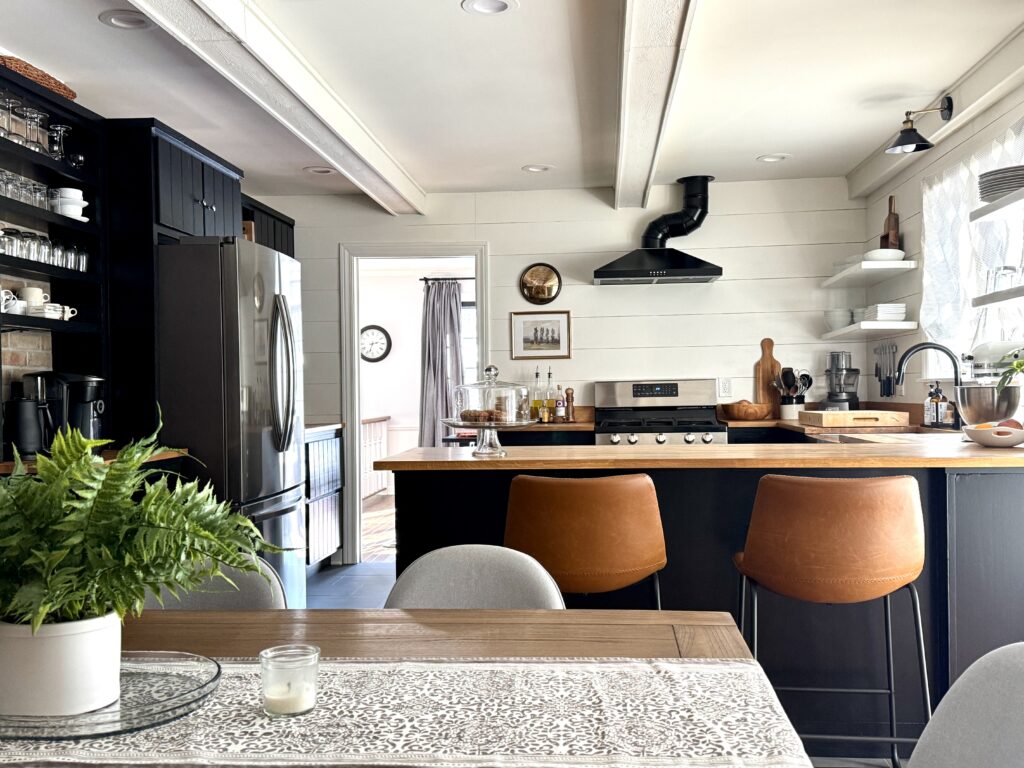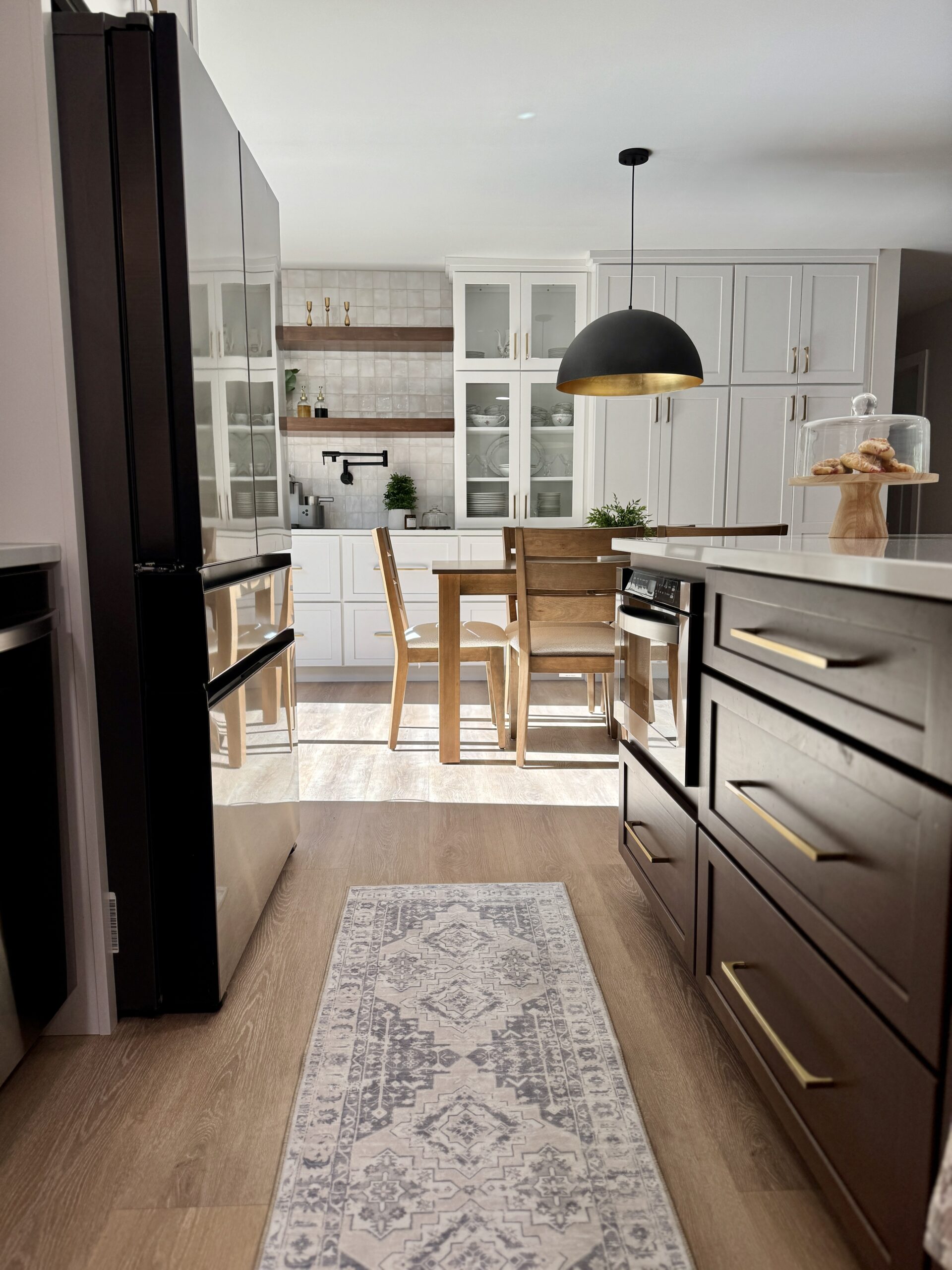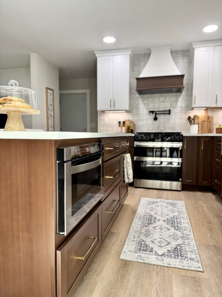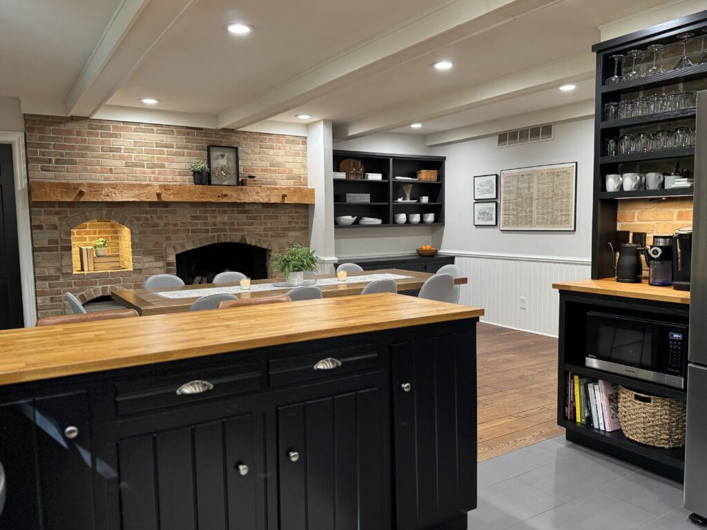 Primary Designer. The homeowners wanted a larger kitchen, so we took down the original dining room wall and expanded the footprint. We carved out space for the new dining room in the oversized living room and added much-needed task lighting and a 10′ island.