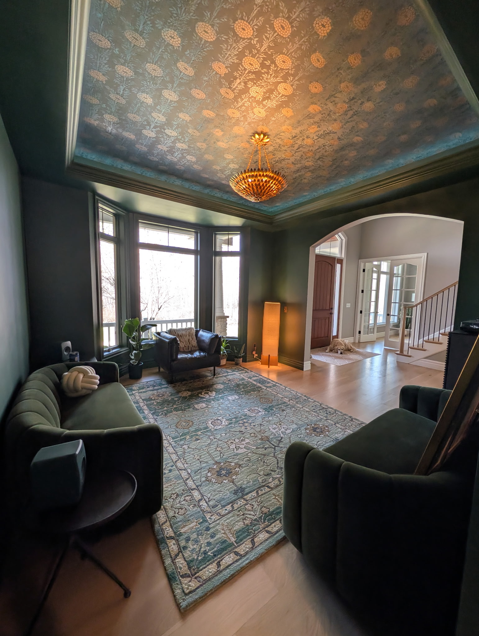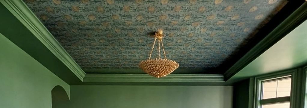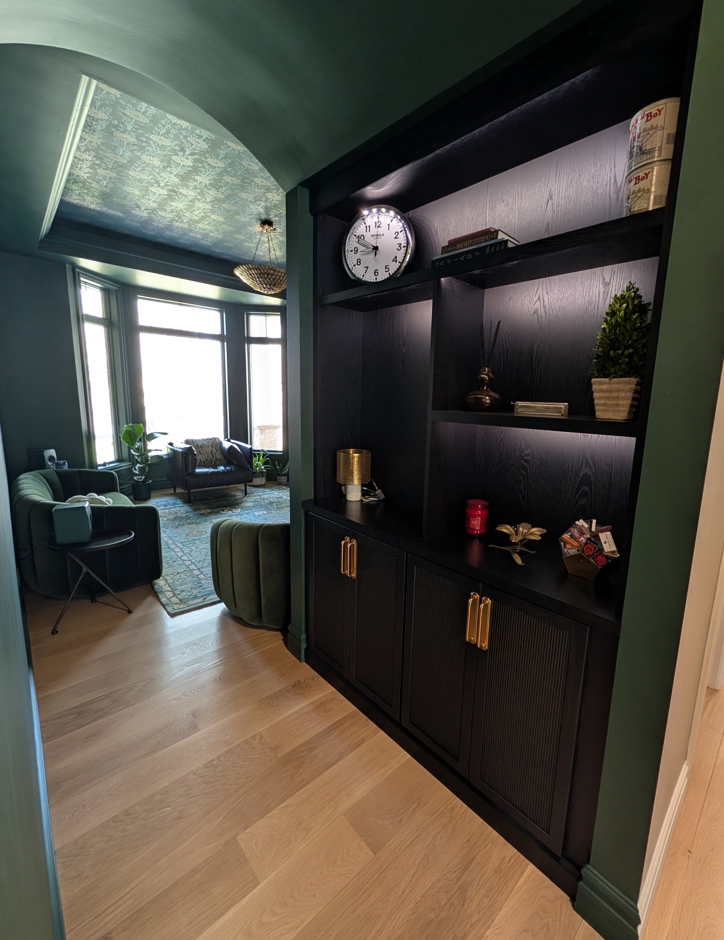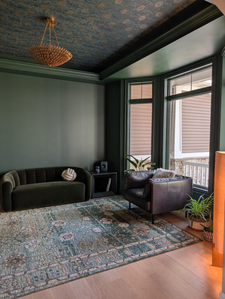 Primary Designer. The homeowners were looking for a space to relax and enjoy a cocktail while listening to music with friends or family. We color-drenched the room, added wallpaper to the ceiling, antique-brass light switch plates, and semi-flush-mount lighting.