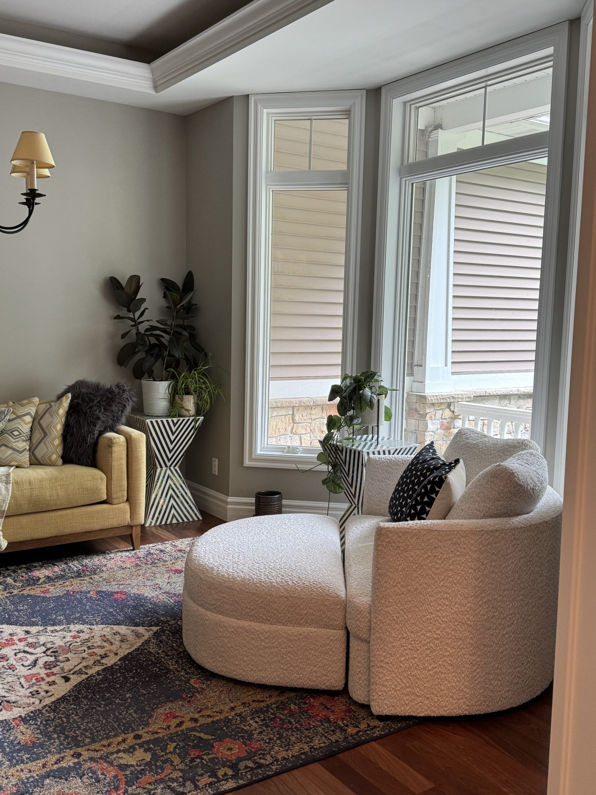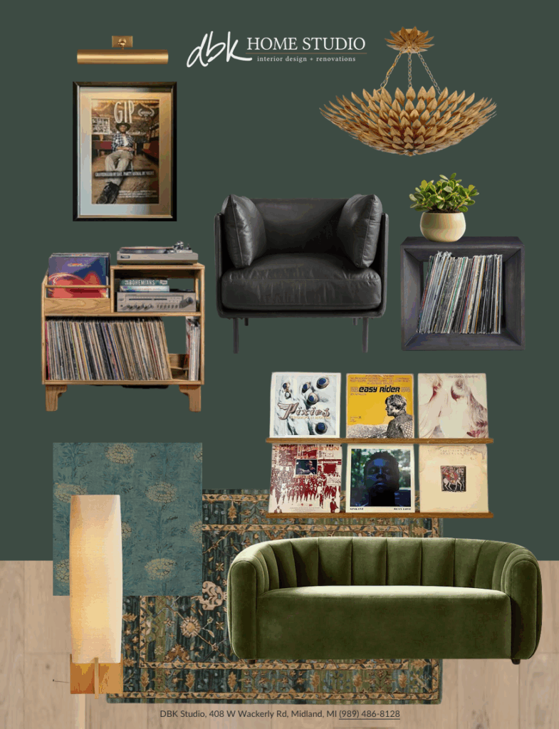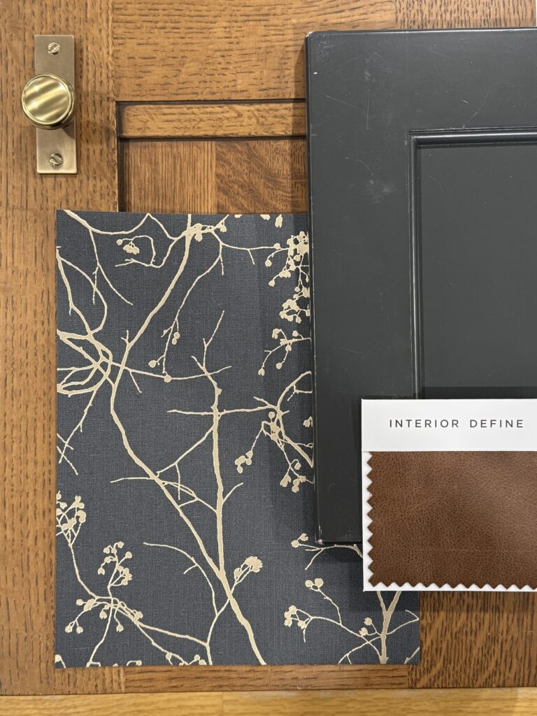 Primary Designer. The homeowners were looking for a space to relax and enjoy a cocktail while listening to music with friends or family. We color-drenched the room, added wallpaper to the ceiling, antique-brass light switch plates, and semi-flush-mount lighting.